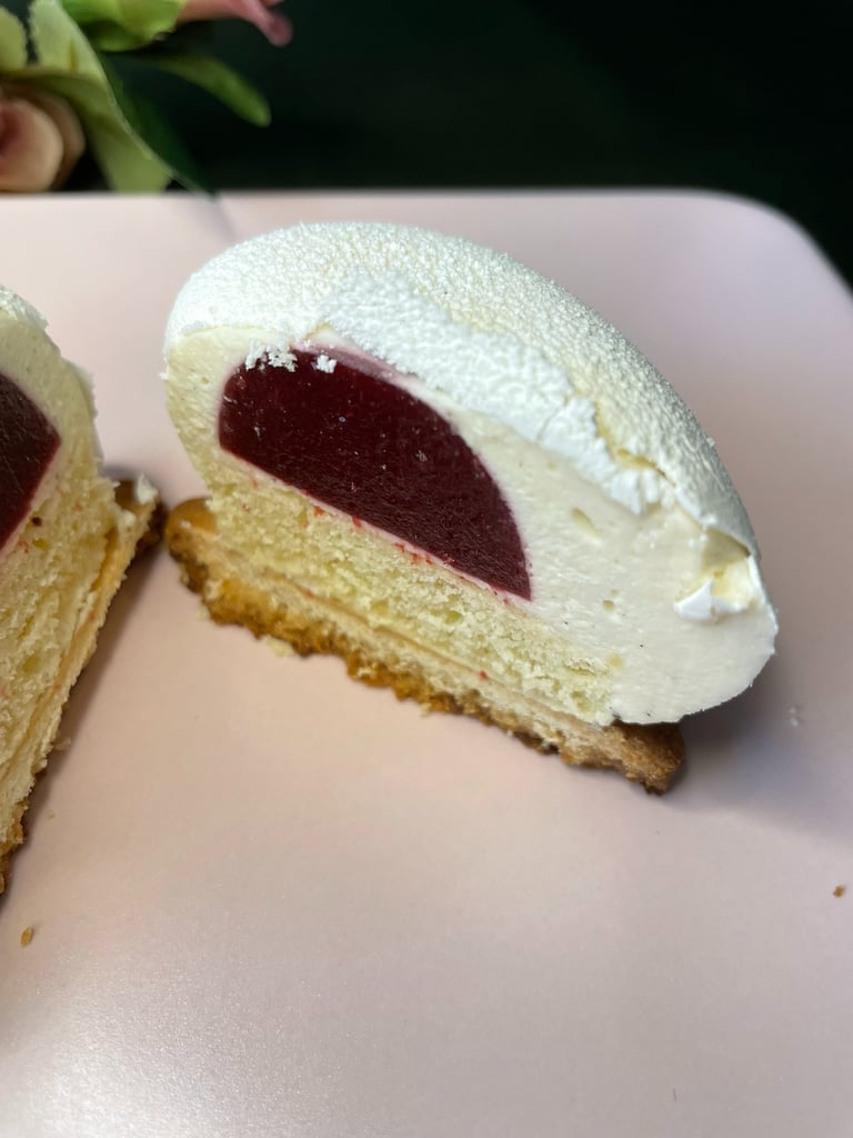 Vue de coupe – base sablée croustillante et cœur fondant.